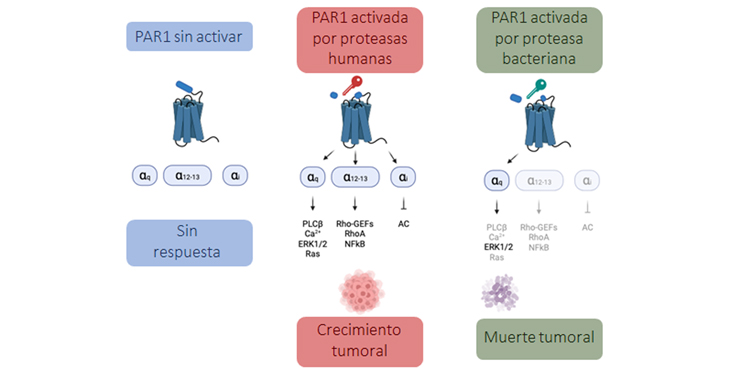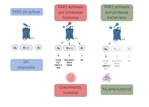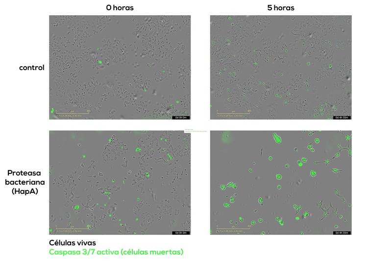 Para entender mejor cómo funciona HapA, se usaron técnicas que permiten introducir en las células cancerosas unos marcadores especiales relacionados con dos receptores de la superficie celular llamados PAR-1 y PAR-2. También se emplearon pruebas para detectar la activación de proteínas que indican muerte celular, como las caspasas, y se estudiaron las rutas internas de la célula que controlan la supervivencia y la muerte, conocidas como vías MEK-ERK.