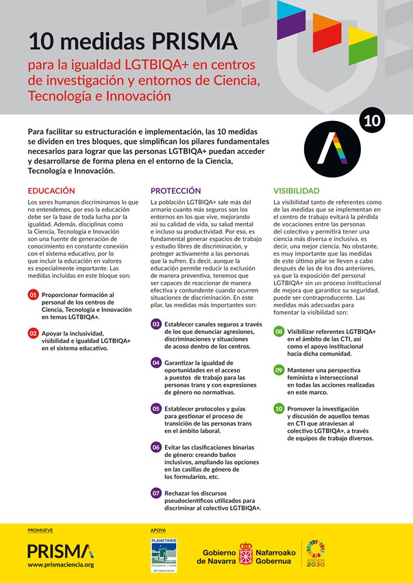 Por otra parte, en las medidas de protección, el CIC ya ha materializado dos de los cinco objetivos de las medidas PRISMA. En concreto, el CIC cuenta con canales seguros a través de los cuales se puedan denunciar agresiones, discriminaciones y situaciones de acoso dentro del centro. Además, el CIC rechaza, como no podía ser de otra manera, los discursos pseudocientíficos empleados para discriminar al colectivo LGTBIQA+.