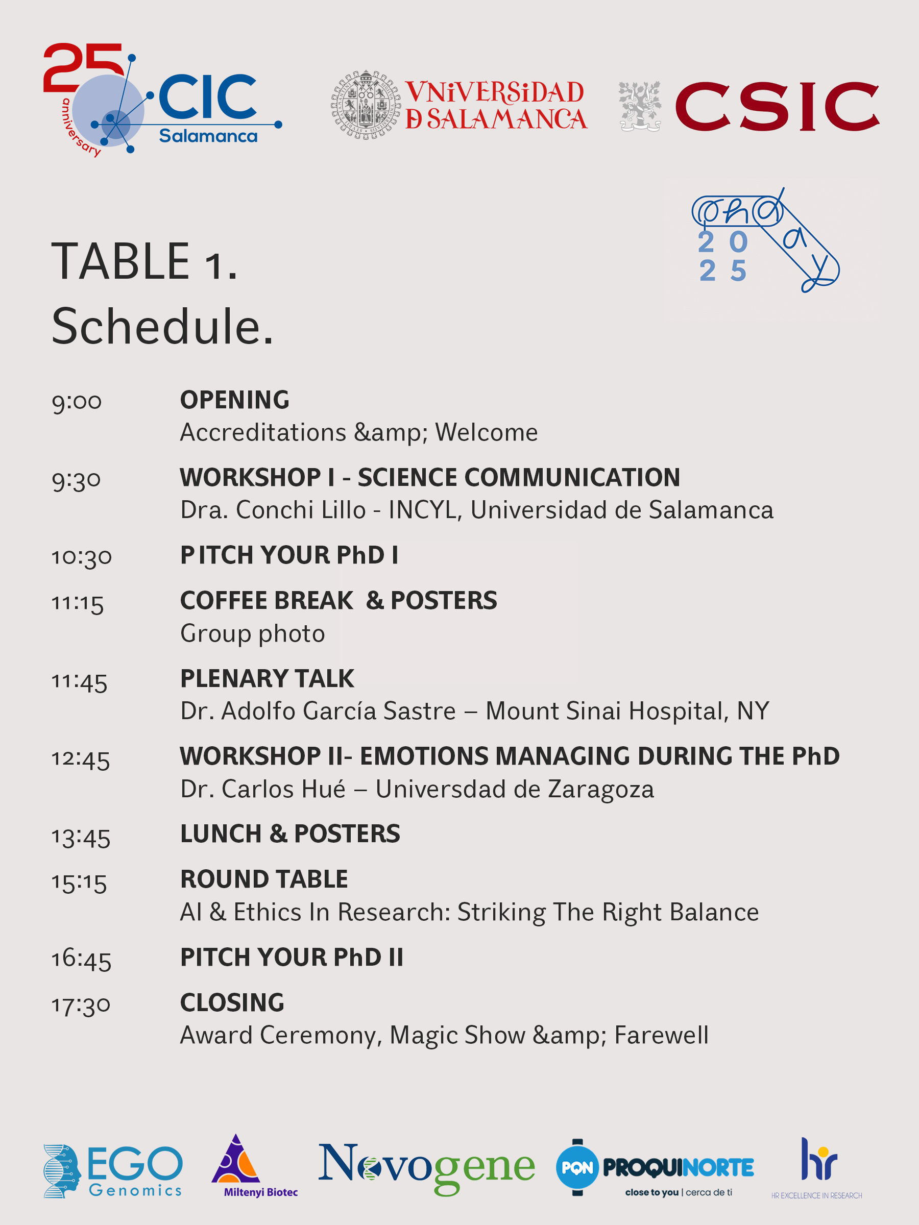 El PhD Day comenzará mañana en el Centro de Investigación del Cáncer a las 9:00 horas. Este encuentro ha sido organizado por predoctorales y está dirigido a predoctorales. El objetivo es visibilizar su talento, fomentar la colaboración y fortalecer nuestra comunidad científica.